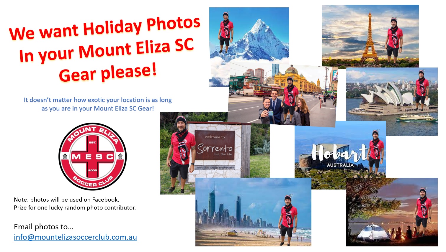 It does not matter if you are going to Sweden, Sri Lanka, Spain, Sandy Bay, Southport or Sorrento we want to see a photo of you in your Mount Eliza Soccer Club Gear.