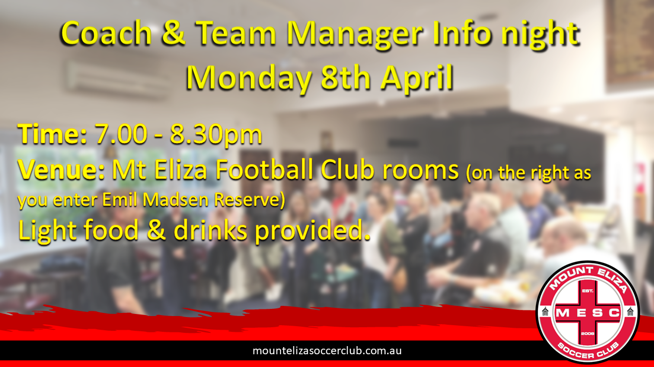 We will be holding our Coach & Team Manager Info night on Monday 8th April, details as