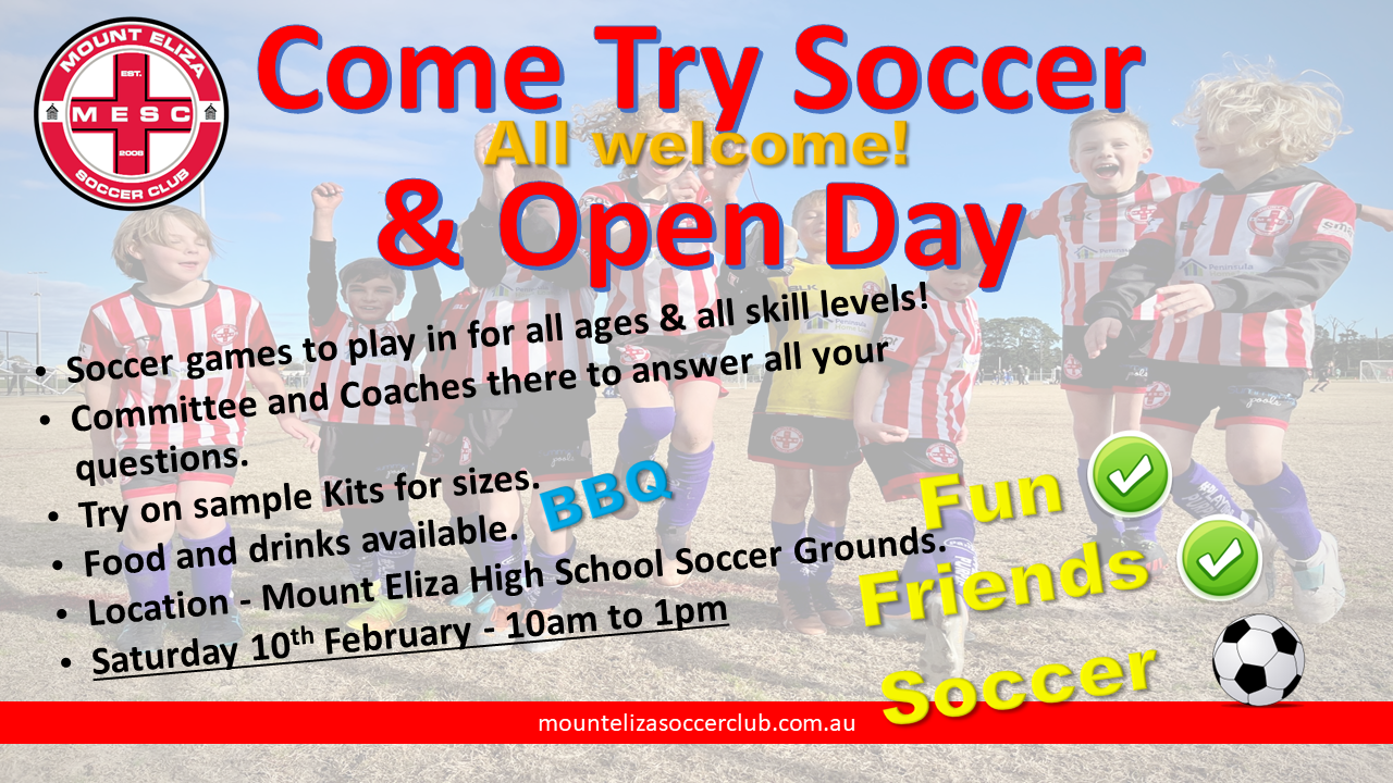 Come down to the Mount Eliza Secondary College on Saturday 10th February from 10am - 1pm for some fun small-sided games, BBQ, meet the committee, and find out further information about the 2024 season.
