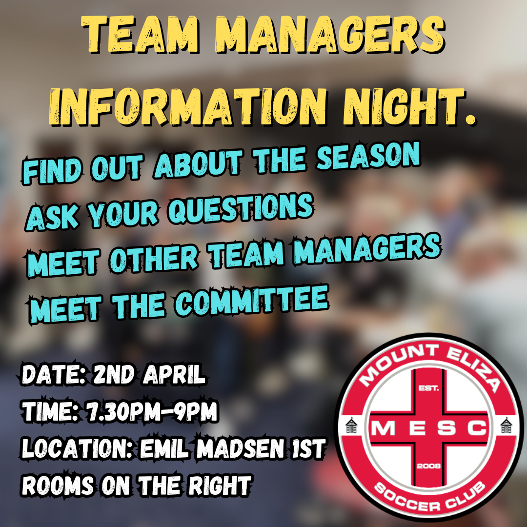 We will be holding our Team Manager Info night on Wednesday 2nd April, details as follows: