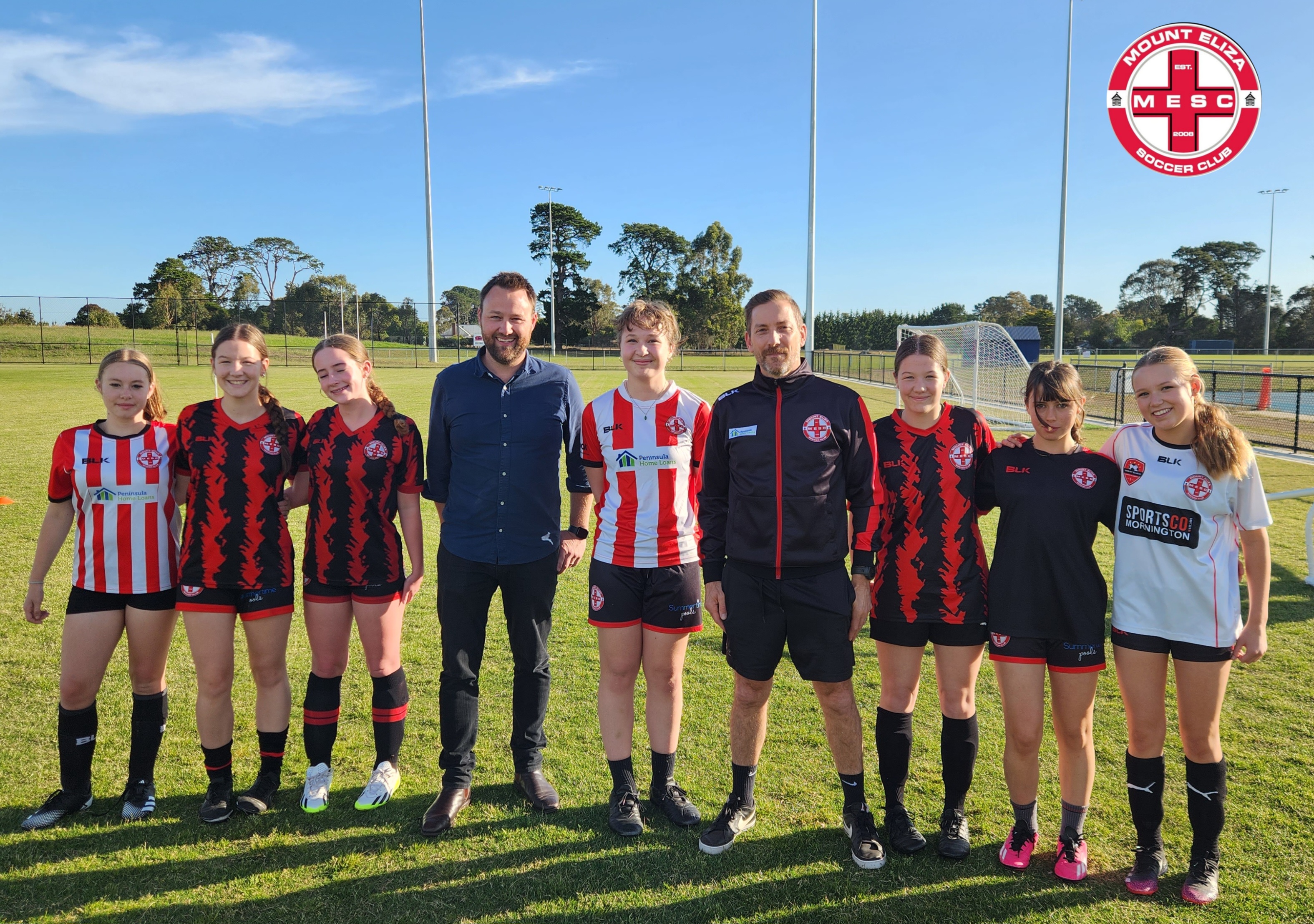 Mornington Community Support Centre CEO Ben Smith and Mount Eliza Soccer Club President Justin Sheppard at Seniors Women's training.